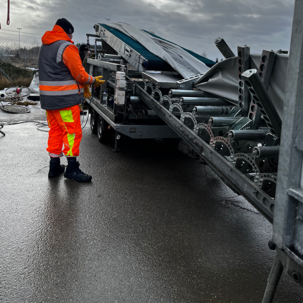 Das Förderband „faltet“ den Inliner auf die richtige Größe. Da keine Erdarbeiten notwendig sind, ist die Kanalsanierung mit Inliner besonders umweltfreundlich und ressourcenschonend.